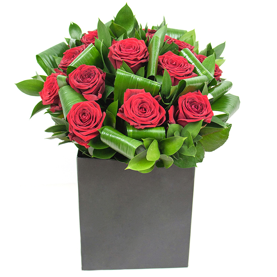 Discover the elegant charm of our Exquisite Red Rose Arrangement, a beautiful fusion of luscious red roses, vibrant aspidistra leaves, and graceful ruscus. Perfectly designed to bring sophistication and beauty to any home.