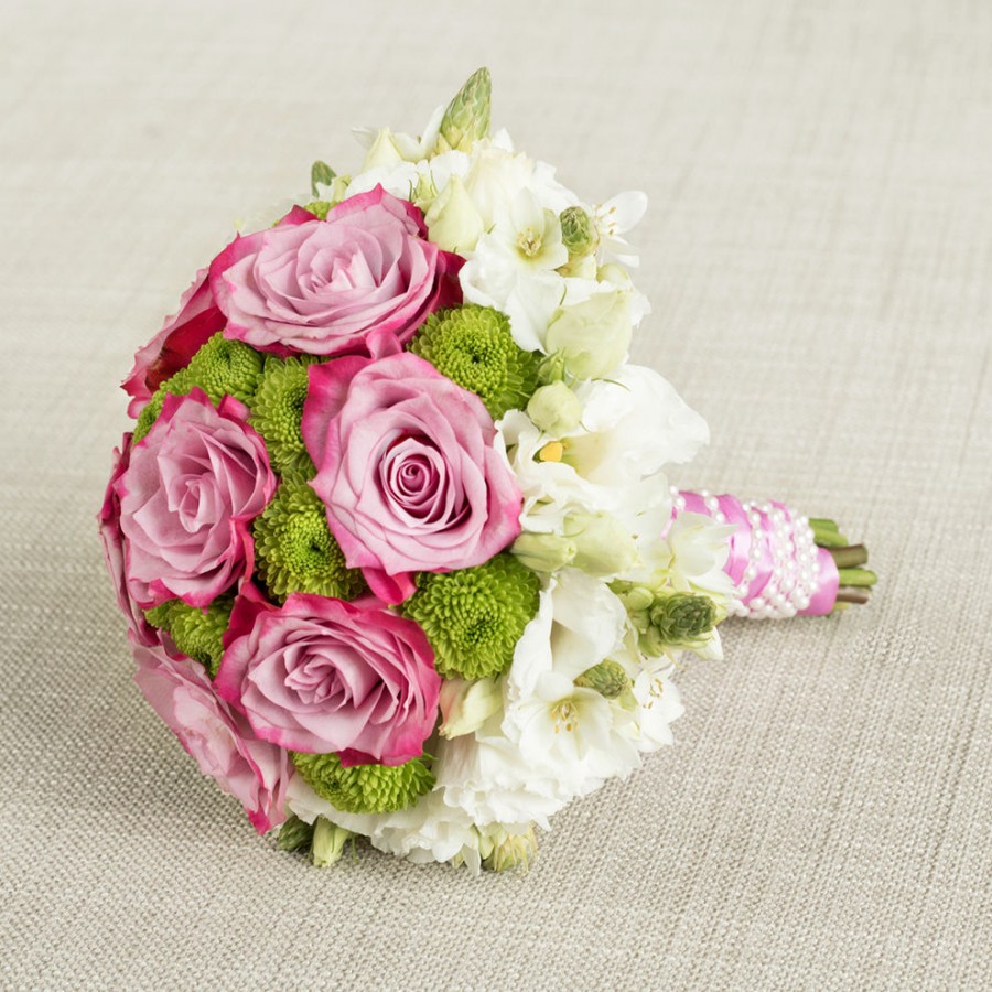 The Pure Romance Bridal Bouquet is a testament to sophistication and grace, ideal for brides who appreciate refined beauty. This exquisite bouquet features a blend of purple, white, and green roses, enhanced by mini chrysanthemums, lisianthus, and anemones, creating a visually stunning and unique arrangement.